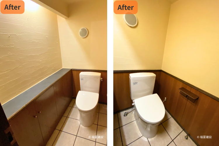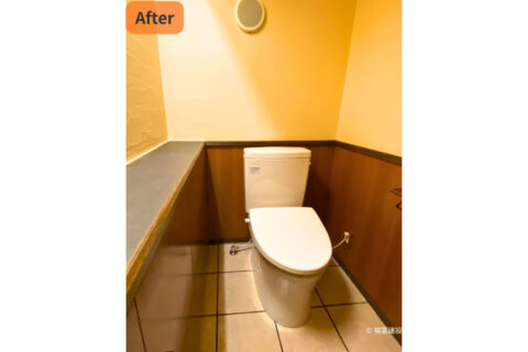 便器周りの汚れやすい位置には、汚れが付きにくく、拭き掃除が可能なパネルを設置。既存の棚と同じ高さまでパネルで覆いました。